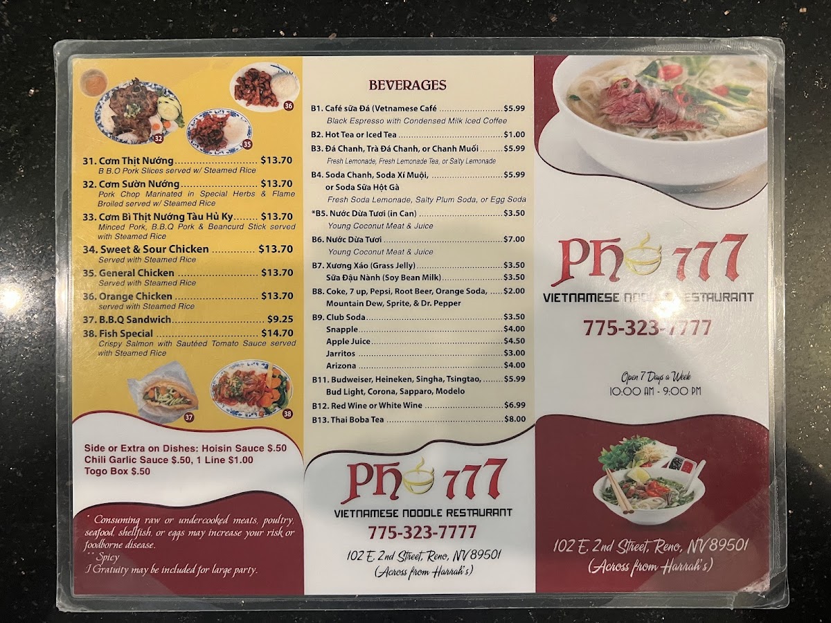 Welcome to Phở 777 Vietnamese Noodle Restaurant, a culinary gem nestled at 102 E 2nd St, Reno, NV. This cozy establishment specializes in authentic Vietnamese dishes, promising a delightful experience for anyone who walks through its doors.